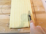 7.ここからは、「伸ばしては三つ折り」という作業を2回と、あと1回は二つ折りをします。途中でバターがはみ出してしまうことのないよう、打ち粉を多めにふって伸ばしましょう。生地が麺棒にくっ付いてしまうと、生地が切れてしまいバターがはみ出しやすくなりますので打ち粉をふって麺棒をかけることがポイントです。そして大事なことがもうひとつ、生地を折りたたむ前にふった打ち粉を刷毛で払います。これを忘れて打ち粉をいっしょに折りたたんでしまいますと、焼き上げた生地が固くなってしまいます。また打ち粉は必ず強力粉を使いましょう。