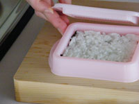 3.蓋の方をピチとセットしギューと押します。ひっくり返し、蓋の方にのせる感じで取り出します。この要領で作りたい数だけ「海苔&ご飯」を作ります。