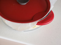 6.赤い蓋をのせます。クックパーに邪魔をされてピチっと蓋はできませんがのせる程度でOKです。500ワットで3分加熱します。いったん取り出し、霧吹きで周囲の卵に軽く霧を吹きます。(周囲の卵はこの段階ですでに固まっています)もう一度電子レンジであと3〜4分加熱します。やり過ぎないように注意しましょう。卵は予熱でも十分に火が通りますので蓋を開けたときに、中央にまだ柔らかい部分があっても、2分ほど蒸らすことで火が通ります。