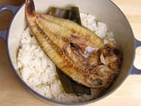 甘鯛のひらきは、両面焼いておく。炊き上がる5分ぐらい前に、一度鍋を取り出し、焼いた甘鯛をご飯の上にのせ、再びふたをしてオーブンへ。炊き上がりを待つ。