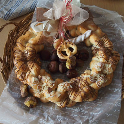 ●リボンの雰囲気で秋にもクリスマスにも合わせることができるのが「リースパン」今回は秋バージョンで仕上げてみました。バターロールや食パンのレシピとは異なり、薄力粉を20%入れます。生地がパンパンに膨らみ過ぎないようにするためです。また油分はショートニングを使うと良いです。無い場合はバターでも可。成形にやや手間がかかりますが、編み込みと違い、こんもり感がでるリースパンに焼き上がります。目で楽しんだら全部いただいちゃいましょ!