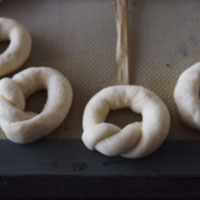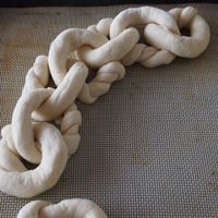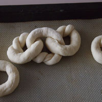 - 次に台の上で細く伸ばしていきます。伸ばす長さは23センチです。そして天板の上に丸く輪にして並べます。