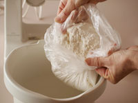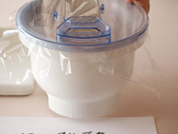 ←発酵器を使わない場合は霧を吹いて内側にショートニングを塗った蓋をして大きなビニール袋に入れてビニールの口を閉じ暖かい場所で発酵させてください。