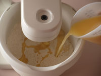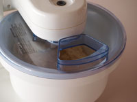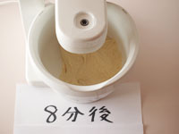 8〜10、およそ7分30秒〜8分捏ねます。この間スピードは「1」のままです。途中でマシーンを止め、側面に飛散った材料をきれいに落し、再度捏ね続けます。捏ねている間はマシーンのそばで生地の混ざり具合をみていてください。