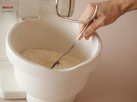 1〜3、ボッシュのボウルに強力粉(カメリア)、ドライイースト、塩、砂糖を入れ全体をかき混ぜます。