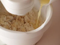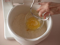 「卵1個+水」をよく溶き、これを注ぎながら捏ねていきましょう。羽はパンフック、スピードは低速の「1」で始めます。またこのときの卵は室温に戻した卵を使います。冷蔵庫から出したばかりの卵では冷たすぎます。