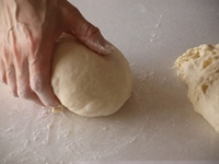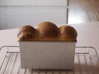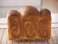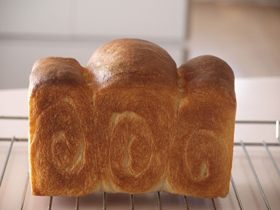 1〜3.第二発酵(目安は真横から見て中央の一番膨れた部分が型の縁から2〜2.5センチほど膨らんだ状態のときです)が終了したら、表面に多めの霧を吹き、180度に予熱したオーブンで35分焼きます。焼き上がったらオーブンから出し、型のまま7〜8センチの高さからトンと落して生地にショックを与えます。それから網の上に取り出します。型にいれたまま放置してしまうと、型と生地の間に放出されない水分がたまってしまいますので、カラっと美味しく仕上げるためにも焼き上がったら型から取り出してあら熱を取りましょう。