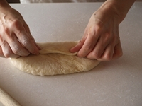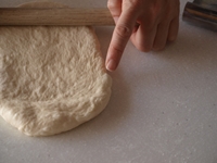1〜3.生地の成形に入ります。うっすらと打ち粉ふった台に生地を取り、麺棒で伸ばします。手前と向こうに麺棒を転がし大きく伸ばします。