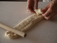 10〜12.生地が伸びたら麺棒で重石をして手前からくるくる巻いていきます。巻き終わりは、指先で生地をつまみくっつける感じです。