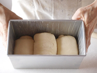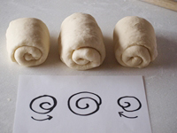 13〜16.3個の生地をくるくる巻いたら、型に並べます。型の内側には必ずショートニング、あるいはバターを塗り残しのないよう塗っておきます。小さめの2個を両端に置きます。そして真ん中に一番大きな生地を置きます。この時注意するのは巻いた方向です。図のように生地を巻き込んだ向きをチェックしてから型に並べます。両端の生地の向きを注意しましょう。中央の生地の向きはどちらの向きでもOKです。