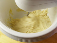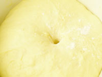 3.こねが終了したら、第一醗酵にはいります。フックをはずしてパン生地の表面がきれいになるように手で丸めます。ボールに戻しラップをして28度のところで40〜45分、第一醗酵にはいります。第一醗酵の温度と湿度はとても重要です。表面を乾燥させないことと、(これはラップをすれば完璧です)温度が高くならないように注意しましょう。