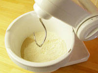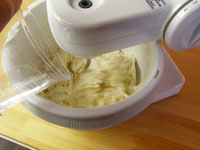 1.ボッシュのボールにぬるま湯と卵以外の材料を入れます。ボールを定位置にセットしたら、羽はパン用のフックを取り付けます。粉の飛び散りを防ぐために蓋をします。