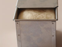 第二発酵終了の目安は蓋をそっと開けてみて、生地があと1センチほどで蓋にくっ付く状態になっていたら第二発酵はOKです。蓋をそっと開ける際、すでに蓋に生地がくっ付いているようなら、すぐに焼きに入りましょう。