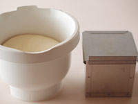 ●ボッシュで捏ねてそのボウルを使って第一発酵を行います。第一発酵終了のめやすはもっとも難しいところですが、今回の倍量で捏ねた場合のみ、ボッシュのボウルすりきりまでの発酵状態がベストと言えます。ということはその半分の強力粉265グラムですからボッシュのボウル容量の半分まで発酵したら、第一発酵は終了と認識できます。膨らみのめやすをチェックするのは難しいことですが、第一発酵はとても重要な工程ですので、その判断力を身につけましょう。発酵している生地を見たときに、ボッシュのボウルのおよそ半分まで発酵していたらOKです。余談になりますが、パン生地は第一発酵が足りないよりは多少、過発酵気味の方が良い生地になります。とはいえベストな第一発酵終了時期を見極めることで、また一歩美味しいパン作りに近づけます。「12センチ角食パン型」一個分の生地を上手に発酵させるためには、1.8ミリリットルのボウルで発酵させると第一発酵終了の見極めが簡単です。すり切りいっぱい発酵した状態がベストだからです。「12センチ角食パン」一個分にふさわしいボウルが見つかったらぜひご紹介させていただきます。