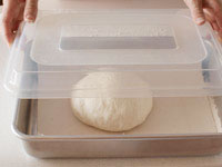第一発酵が終了したら、軽く打ち粉をふった台に生地を取り出し2個に分割します。軽くガス向きながら丸め直し、キャンバス生地の上で20分のベンチタイムにはいります。高さのある「3ピースベイカーズ」でベンチタイムがおすすめです。蓋があるので表面の乾燥を防ぐことができます。ない場合はキャンバス生地に並べその上からもキャンバス生地をかぶせておきましょう。