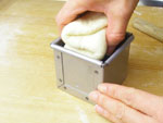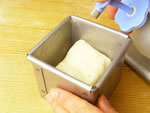 6.15分のベンチタイムが終了したら成型です。台に生地を置き麺棒で手前、向こうと麺棒をかけてガス抜きをします。裏返して手前3分の1たたみます。向こう側3分の1もたたみます。今度は生地をさらに細長くするために左手の中ゆびと人指しゆびの間ではさみ麺棒をかけながら生地を伸ばしていきます。(生地を切らないために指ではさんで持ちます。親指と人差し指で持つと生地を切ってしまいますので要注意!)今回は角型食パン(サンドイッチ用の食パン)の要領でたたむ方法の成型です。くるくる巻き込む成型に比べ、角がきれいに出やすいのでぜひたたむ成型でやってみてください。全体を「M」の字を横にした感じでジグザクにたたみ、型に入れます。軽く霧を吹き蓋をして第二醗酵にはいります。36度で35分待ちましょう。蓋をしていますから乾燥しにくい上、ビニール袋に入れて醗酵する場合にも出し入れがラクですね。