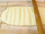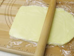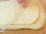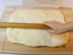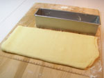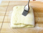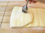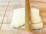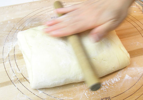 7.ここからは、「伸ばしては三つ折り」という作業を2回と、あと1回は二つ折りをします。途中でバターがはみ出してしまうことのないよう、打ち粉を多めにふって伸ばしましょう。生地が麺棒にくっ付いてしまうと、生地が切れてしまいバターがはみ出しやすくなりますので打ち粉をふって麺棒をかけることがポイントです。そして大事なことがもうひとつ、生地を折りたたむ前にふった打ち粉を刷毛で払います。これを忘れて打ち粉をいっしょに折りたたんでしまいますと、焼き上げた生地が固くなってしまいます。また打ち粉は必ず強力粉を使いましょう。