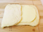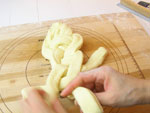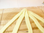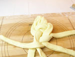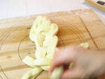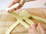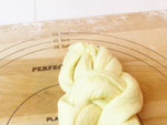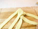 (1)等分にしたパン生地は切り口を横にして、片方の端を重ねてくっ付けます。編み込んでいくために反対側は放射線状に広げます。