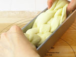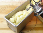 10.綺麗に編み込んだ生地を両手で持ち上げて型にそっとおきましょう。これで成型が終わりました。霧をふき大きめなビニール袋にすっぽりと入れて第二醗酵をします。29度で約60分の醗酵です。