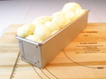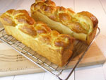 11.第二醗酵が修了したら表面に溶き卵を塗ります。190度に余熱したオーブンに入れて10分、温度を180度に下げてあと6〜8分ほど焼きます。途中で表面の焼き色が付き過ぎたときは、アルミ箔をすっぽりとかぶせるとそれ以上焼き色が付きません。そして時間までしっかりと焼き上げましょう。表面のこんがりキツネ色が、目安です。焼き上がったら型ごと、10センチほどの高さからトンと落とし、網に取り出します。アラ熱を取り、召し上がってくださいませ。