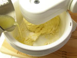 2.卵と水を容器に入れてかき混ぜます。この卵液をボウルに注ぎながら一番低速の「1」で捏ねていきましょう。時間はおよそ5分〜5分30秒。この間、途中でマシーンを止め、側面に飛散った材料を落とし生地全体に馴染ませ、再度捏ねましょう。今回はあまり捏ねなくて良いです。捏ね足りないくらいでOKです。