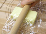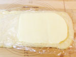 4.第一醗酵している間に中に折り込むバターの準備をしましょう。折り込み用のバターは薄く四角(10×16センチくらい)に伸ばしておきます。使う少し前まで冷蔵庫に保管しますが、使うときにカチンカチンでなく、ちょっと冷たいくらいが良いです。こんな感じでしっかりとバターの準備をいたしましょう。折り込むときのバターの固さはとても重要です。硬すぎず、柔らかすぎずです。
