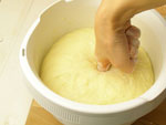 3.捏ね上げた生地を取り出し、表面を綺麗に丸め直しボウルに戻します。乾燥しないようラップをして第一醗酵に入ります。いつもよりちょっと低めの27度で60分の醗酵です。