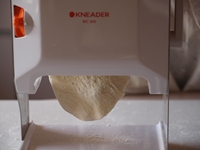 13〜15.ぐるぐるハンドルを回すと下から薄く伸びた生地が出てきます。出てきた生地の両面にまた打ち粉を付けます。再度、製麺機にかけてのします。二回目の「のし」からは徐々に薄くすると良いです。うどんにはダイヤル「4」(厚み2.5ミリ)あるいはダイヤル「3」(厚み2ミリ)くらいがおすすめです)
