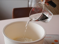 1〜3.ボウルをマシーンにセットし薄力粉を入れます。塩も加えます。分量の水を一気に注ぎ入れます。(この時の薄力粉はふるわなくて良いです)始めはぽろぽろした状態ですが少しずつ生地がまとまってきます。