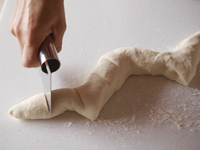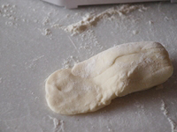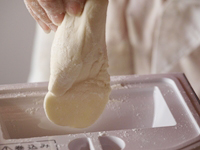 7〜9.ねかせた生地を打ち粉をふった台に取り出し、スケッパーで「M」の字にカットし横に長くしてから9等分します。1個がおよそ50グラムです。打ち粉をふった台の上に転がし全体に粉を付けます。打ち粉は強力粉を使います。