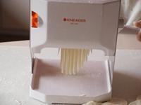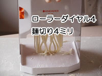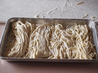 16〜18.お好みの厚さになったらここからは麺切りです。お好みの太さを選びカッターをセットします。(2・3・4ミリの3種類)画像は4ミリで麺切りしたものです。カットされた麺を並べるためのバットを用意しましょう。片栗粉をふっておきます。。