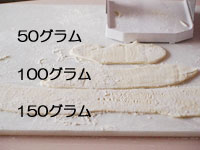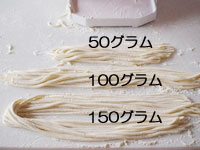 ※一度に製麺機で「のす」作業、あるいは「麺切り」できる量は、取り扱い説明書では50グラムと記載されております。実際に試したところ50グラムではやや短く感じました。そこで100グラム、150グラムとやってみました。一番しっくりくるのが100グラムで、150グラムでは長すぎです。50グラムは少々短めですが、お子様用にはちょうど長さです。