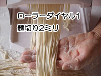 いろいろ試してみると面白いです。左側は「のし」をダイヤル「1」(厚み1ミリ)でおこない、麺切りの太さは一番細い2ミリで出来上がった細うどんです。お上品な味わいのうどんがお好みの方におすすめです。一見ラーメン?かしらと思うほど細い仕上がりですが、茹で上げはまさに細うどんです。また右側の画像は一番太いうどんに麺切りしているところです。コシのある太麺がお好み方におすすめです。