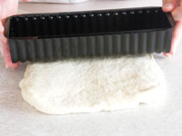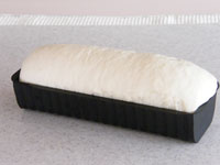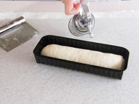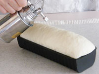 4.ベンチタイムが終了したら、成型です。台に打ち粉をふり麺棒で四角に伸ばします。手前から海苔巻きの要領でくるくる巻き込みます。巻き終わりをきっちりとめ、閉じたところを下にして型に入れます。霧をふいて第二発酵に入ります。33〜35度のところで約35分、発酵させます。