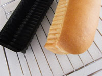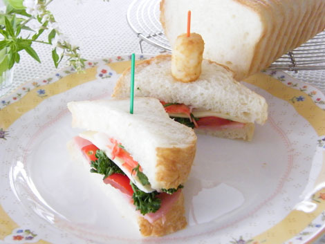 ●波を打ったようなラインが美しい一体成型のパウンド型で、スーパーキングとフランスパン専用粉、1対1のフカフカ食パンを焼きました。焼き上げてあら熱がとれたら底の方からスライスしてフレッシュハーブのサンドイッチを作ります。上質の粉で焼き上げた食パンは、耳まで美味しいサンドイッチになりました。