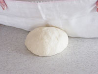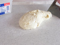 3.それでは、第一発酵が終了した生地を打ち粉をふった台に取り出します。今回は分割はしません。軽くガス抜きをしてきれいに丸め、15分のベンチタイムに入ります。表面が乾燥しないよう、キャンバス生地をかぶせさらにビニール袋で覆っておくと良いです。