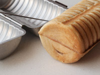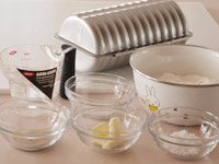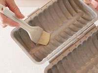 1.次にパン生地を準備します。今回はホームベーカリーで第一発酵まで行います。材料を専用のポットに入れてスイッチON!第一発酵終了まで待ちましょう。この間に型の準備をしておきます。合わせトヨ型の内側にショートニングを塗っておきます。塗り残しのないよう、しっかり塗っておきましょう。