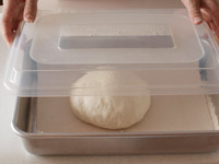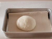 2.第一発酵が終了したらガス抜き→丸めをおこないます。Lの字を書くようにガス抜きをし、表面をツルンときれいにします。キャンバス生地(麻の布も毛羽が少なくお奨めです)の上でベンチタイムを取ります。表面を乾燥させないよう上にもキャンバス生地をかぶせ大きなビニール袋に入れておけば、もう完璧です。15分のベンチタイムをとります。このときノルディックウェアの「3ピースベーカーズ」はとても便利!乾燥させずにベンチタイムができます。