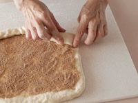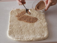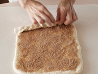 4.大きな四角に伸ばしたら、溶かしバター(分量外)を刷毛で塗ります。巻き終わり部分にはバターは塗りません。シナモンシュガーを全体に均一にふります。手前からきっちりと巻きましょう。全体を転がすのではなく、右から、左へ、次は左から、右へと左右に細かく巻き込んでいくと、きっちり巻くことができます。ふかふかに巻き込んでしまうと、出来上がったときに美しい筒状になりません。頑張ってきっちりと巻き込みましょう。ポイントは空気を入れずに巻き込むことです。
