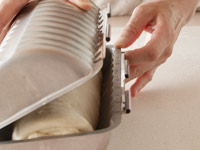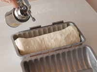 5.巻き終わり部分はピチっと閉じます。そして型にそっと置きます。軽く霧をふき蓋をかぶせストッパーをして第二発酵に入ります。