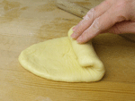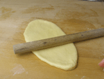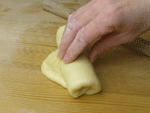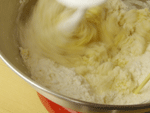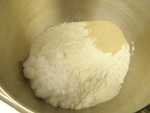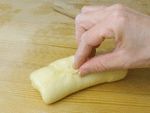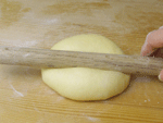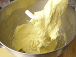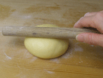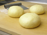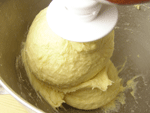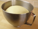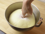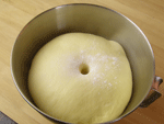 2.捏ね上がったらマシーンからはずし、手で表面をきれいに丸め直しボウルに戻します。乾燥しないようにラップをして25〜26度のところで60〜70分の第一醗酵にはいります。やや低めの温度でいつもの第一醗酵より時間をかけてじっくりと醗酵させます。生クリームとバターの油脂分が多いので低温で醗酵させる方が安定した生地になります。