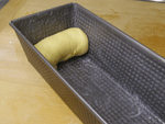 それではベンチタイムが終了した生地を成型していきます。台の上に生地を置き麺棒で縦方向にのばし、ひっくり返し手前からきっちり巻き、巻き終わりはピチっとくっ付けます。閉じ目を下にして型並べ全部で5個の俵型の生地を型に並べたら成型は終了です。5個の俵型がバランスよく収まるよう、まず1個目と2個目は両端へ3個目は真ん中に置きます。4個目と5個目は間の隙間に並べます。こうするとバランスよく並べることができます。霧を吹いて型ごと大きなビニール袋にいれます。このときビニールが生地にくっ付かないように気をつけましょう。この段階で大事なのは乾燥させないために霧を吹くのを忘れないことです。