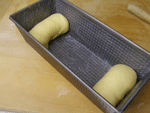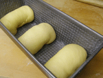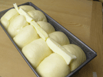 5.第一醗酵よりちょっと高めの34〜35度で30〜35分の第二醗酵にはります。真横から見て一番膨らんだ部分が1.5〜2センチくらい型より飛び出しているくらいまで醗酵したら第二醗酵は終了です。キッチンバサミで真ん中に切り込みを入れトッピング用のバターを並べます。多めに霧をふき準備は完了、あとは焼くだけです。