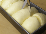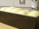 ●さてそんなときに、このエンボス加工の軽めの食パン型に出会いました。試しにこの型でホテルブレッドを焼いてみたところ、初めて食パンとしての全体の焼き色に満足のいくものに焼き上がったのです。やっぱり焼き色って大事ですよね。このエンボス加工の食パン型、断面積が日本の食パンに比べやや小さく、このこともとても気に入っています。オーブントースターに並ぶ枚数が一枚増えました。一番のお気に入りになった食パン型で外はパリっと、中はふんわりコクのあるとびっきりのホテルブレッドを焼き上げます。材料はとてもリッチな配合ですので、焼き上げたらまず何も付けずに召し上がってみてください。水の代わりに生クリームと卵をたっぷり使ったコクのあるホテルブレッドです。マシーンはデロンギの「パティシエ」を使用しました。