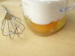 1.小さめのボウルに卵を割りほぐし、そこへ生クリーム・水(ぬるま湯)を加えて均一にし、湯せんにかけながら人肌くらいまで温めます。デロンギのボウルにスーパーカメリア・ドライイースト・塩・砂糖・柔らかくしたバターを入れます。羽はパン用のフックをセットします。透明カバーをして注ぎ口から割りほぐした卵・生クリーム・水(ぬるま湯)を注ぎいれながら、スピードは一番低速の「2」で捏ねていきます。卵と生クリーム液が全て入ったらそこから約7分30秒〜8分間、低速のままでミキシングしていきます。途中で2〜3回マシーンを止め、ボウルの側面に飛び散った粉などをきれいにします。また捏ね始めて生地が硬いようなら水をほんの少し(大匙1〜2くらい)加えると良いです。柔らかい生地の方がふかふかのパンになります。捏ねが完了したかどうかは指で生地をそっと伸ばして確認します。ゆっくり伸ばし、切れずに薄く伸ばせたらOKです。すぐにブチっと切れてしまうようであればさらにもう1〜2分低速で捏ねましょう。