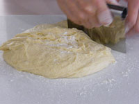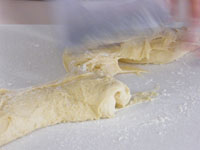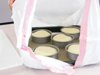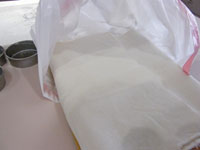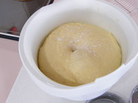 4.ベンチタイムが終了したら、いよいよ成形です。成形はとても簡単です。軽く打ち粉をふった台に生地を置き、手のひらで2〜3回たたき空気を抜きます。そしてショートニングを塗った型にそっと置きます。表面に霧をふき、大きなビニール袋ですっぽり覆い、第二発酵に入ります。