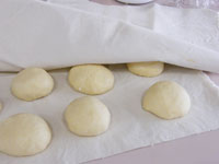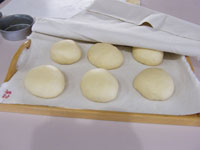 3.第一発酵が修了した生地を台に取り出し、5等分します。一個がだいたい110〜114グラムです。ガス抜きをしながら丸め直します。キャンバス生地の上に置き、上からもキャンバス生地をかぶせ、さらに大きなビニール袋でくるんでおくと完璧です。この状態で15分のベンチタイムを取ります。