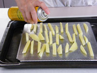 3、ドーナツ天板に切ったジャガイモを並べてスプレータイプのオイルを吹きかけます