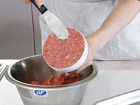 ハンドルをあらかじめすこし押した状態でお肉を詰めます。1センチくらいのハンバーグもきれいにできました。