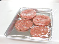 ※バットに4枚並べたら、ラップをして、その上にも並べていきましょう。全部のハンバーグが完成したら蓋をして冷蔵庫で保管できます。
